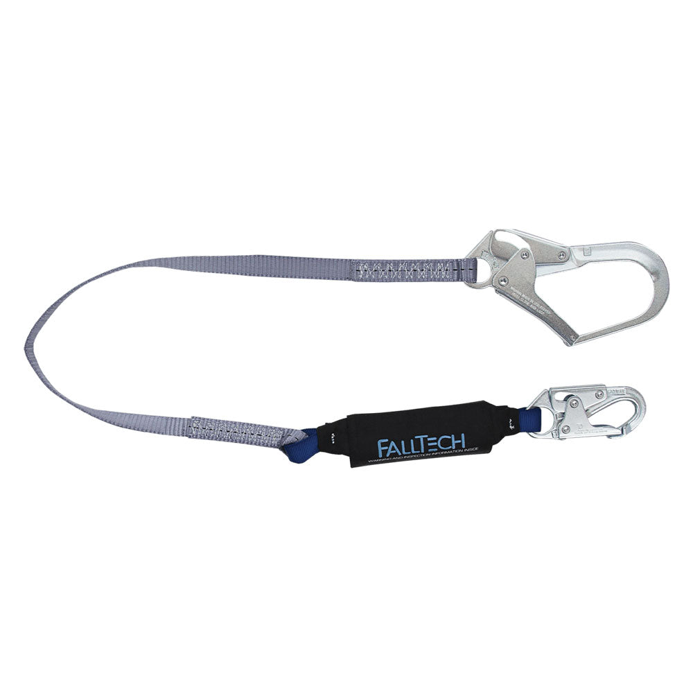The FallTech ViewPack Shock Absorbing Lanyard with rebar hook is a 4 ft. lanyard with rugged webbing, and a shock pack to reduce impact forces.