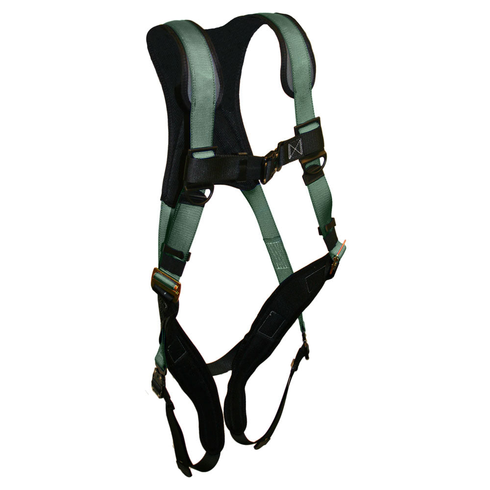 This safety harness has comfortable leg and shoulder pads with built-in flame resistant open cell foam for softness, breathability, and moisture control. This padding will remain comfortable all day long and won't wear down your guys throughout the day.