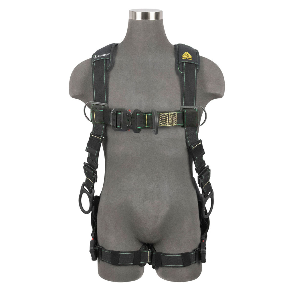 The Safewaze Arc Flash Aramid Dielectric Climbing Tower Harness is a durable harness provides superior protection in an arc event situation with front chest d-ring and side positioning d-rings for hands free work.