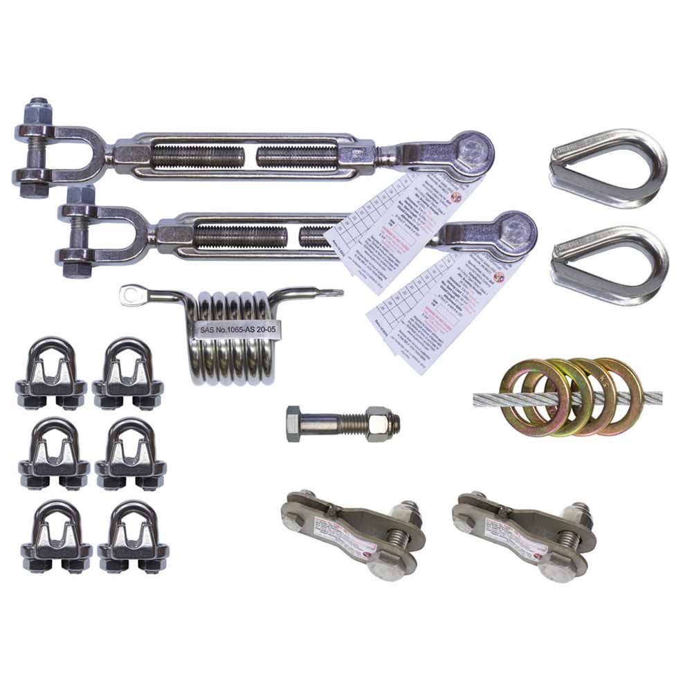 * Rigging Kits: our standard turnbuckle/clamps/thimbles/sliders/energy absorber for lifeline lengths up to 120’. They include everything you need for a complete installation except for the cable.