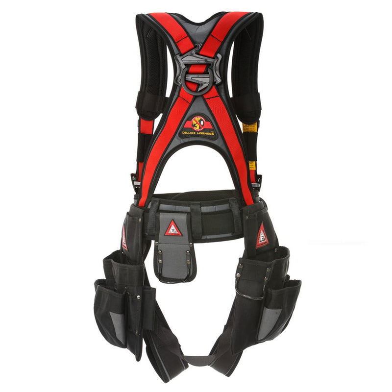 The Red Super Anchor Deluxe Tool Bag Harness is a comfortable construction harness that includes an integrated tool belt with pouches and hammer holders for added convenience.